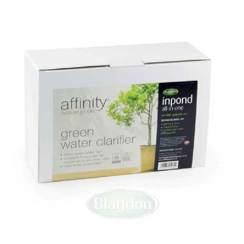 5w UVC upgrade for blagdon affinity all in one 1400 pump. This easy to use kit will add the Green Water Clarifier to clear algae and green water. The 5w UV kit for all in one half moon, octagon and pillar rattan ponds. The unit includes the UVC and complete base.