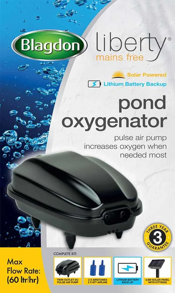 The Blagdon Liberty Solar Air Pump Kits are very easy to set up to keep your pond oxygenated. The pump is powered by a 0.8w solar panel with battery back up. Sunlight on the solar panel produces more energy than the pump needs to run, the excess power is stored in the battery. If the solar panel is not receiving any light the power stored in the lithium battery is used to run the pump. The kit includes everything you need in the box with the pump are 2 x air stones and 2 x 6 feet of air line.