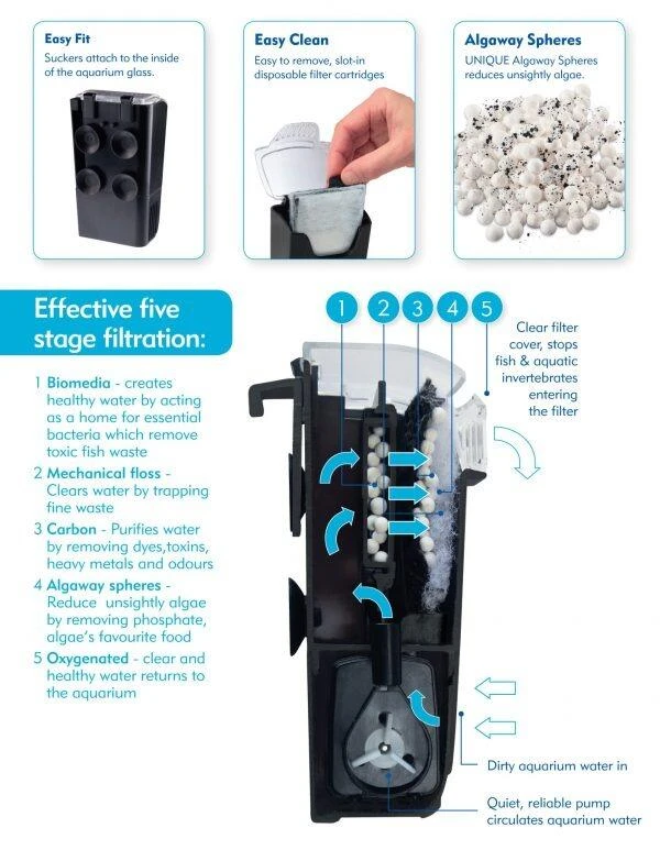 The Mini CF filter has all the features needed to keep your aquarium clean and healthy. Â This supper quite filter will keep your water balanced with the ceramic tubes creating the perfect environment for good bacteria to flourish. Along with cleaver algae prevention spheres and mechanical floss cartridges to sieve out waste and active carbon purifying the water all help keeping the algae at bay. Cleaning your filter couldn’t be easier with an easy flip up hinged lid and easy replacement cartridges simply pop in and out saving time minimising maintenance.